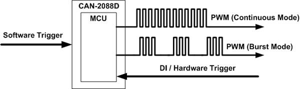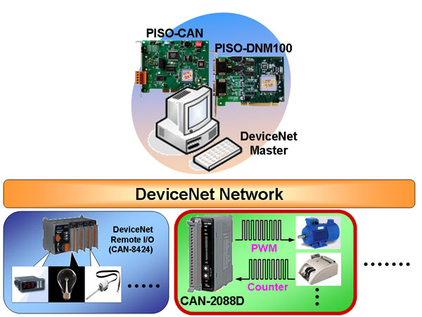 PWM (Pulse width modulation) is a powerful technique for controlling analog circuits. It uses digital outputs to generate a waveform with variant duty cycle and frequency to control analog circuits. CAN-2088D is a PWM slave module of DeviceNet protocol. It has 8 PWM output channels and 8 high speed counter channels. It can be used to develop powerful and cost effective analog control system.
